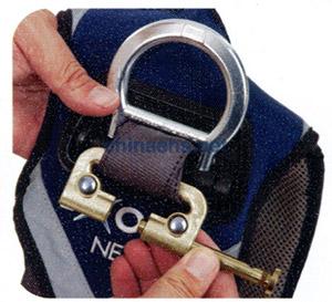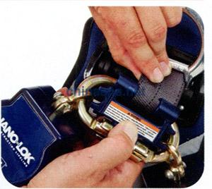 4.向上推塑料插件,鉤環(huán)安全鎖朝內(nèi),打開連接器,將鉤環(huán)開口插入自鎖速差器上的旋轉(zhuǎn)環(huán)內(nèi),轉(zhuǎn)至另一側(cè)