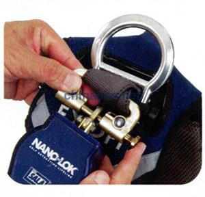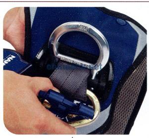 5.將鉤環(huán)開口端掛到背部D型環(huán)下方松垂的織帶上,依次安裝第二個(gè)自鎖速差器